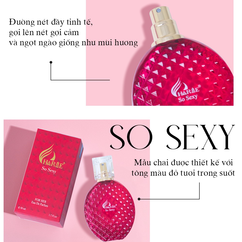 Charme So Sexy 50ml mang đến mùi hương cực kỳ gợi cảm và thu hút, và chắc chắn sẽ không bao giờ phải làm bạn thất vọng. Mẫu chai được thiết kế với tông màu đỏ tươi trong suốt cùng những đường nét đầy tinh tế, gợi lên nét gợi cảm và ngọt ngào giống như mùi hương.